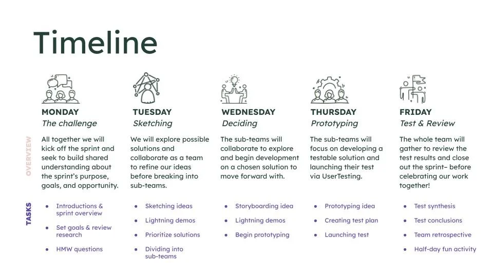 Early in December, I (Tabo) worked with missionaries from the UK and Ireland in Birmingham to explore potential solutions during a one-week Design Sprint. The idea was to work in a rapid process to be able to design, prototype, and test two different alternatives with a group of people in this category. You can see here how our week looked: